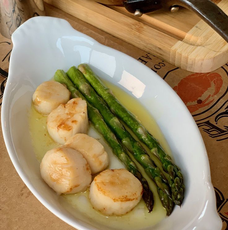 Preparing sea scallops is easy! Heat a pan, season the scallops lightly and sear, in just a little oil or butter, for only 30 seconds on each side. As soon as they turn opaque, they're done.