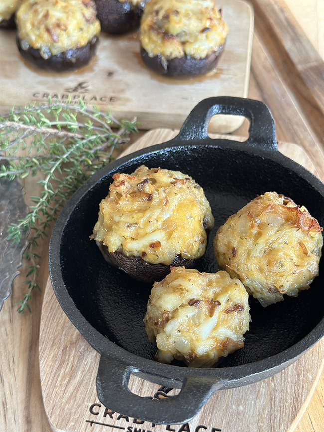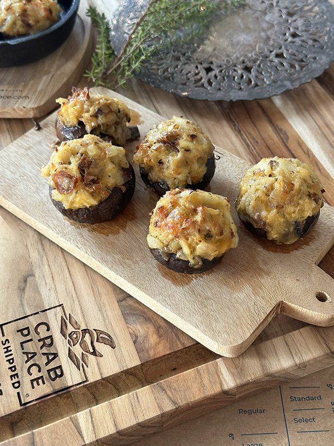 Crab-stuffed mushroom caps are the ideal party appetizer— you can assemble them the day before, refrigerate until it’s party time, and then bake them moments before your guests arrive. These caps are extremely versatile too and welcome substitutions—such as chopped lobster, snow or king crab meat; a mild Farmer’s cheese; whatever fresh herbs you have on hand. Blue Crab can be expensive, so if you are looking to save a little, double the amount of bread while reducing the crab. In this case, soak the bread in dry white wine to give it more flavor.