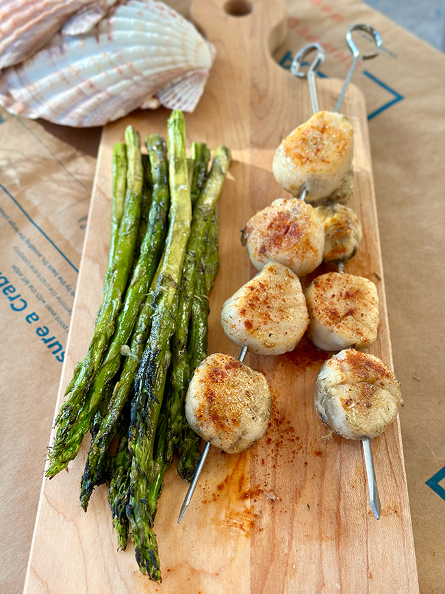 Place the asparagus on the center of the grill and baste them with the sauce. Take care not to create any flare-ups. Cook for 2 to 3 minutes and flip. Baste again. Next add the scallops. Based them. Cook for about 2 minutes per side, or until they are just cooked through. Baste continuously so the scallops don’t dry out. Serve promptly.