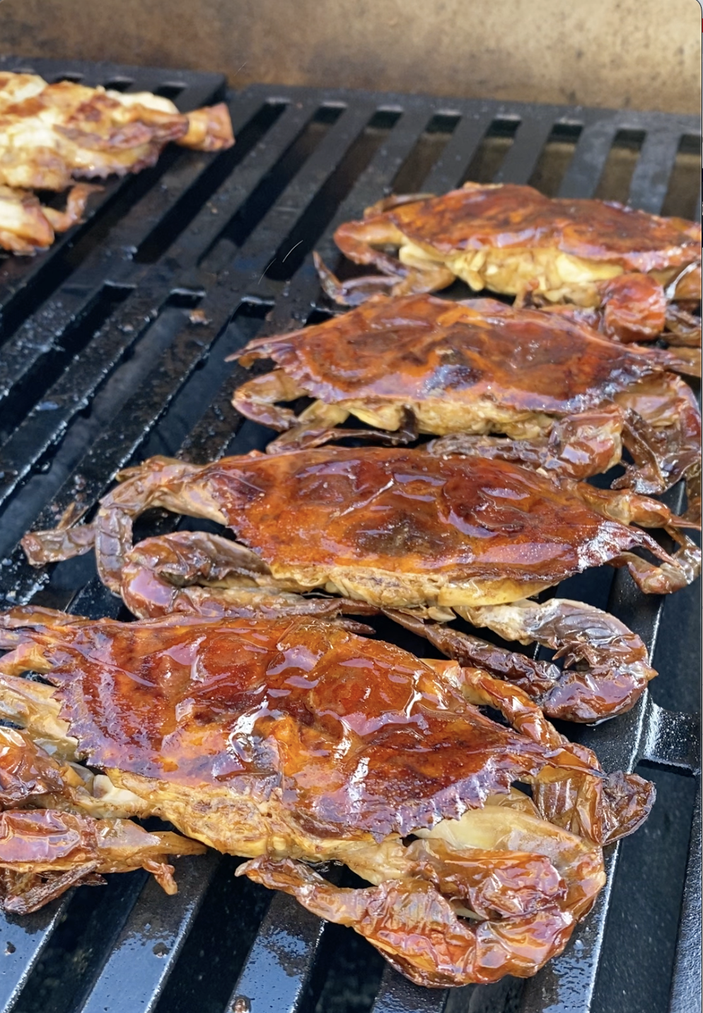 Ensure the grill is properly preheated to prevent sticking and achieve a nice sear on the crabs.