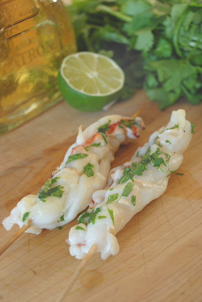 I know what you are thinking...tequila and lobster? Trust me, it’s delicious. In fact, it’s so good, I’ve even ventured out during a snow blizzard just to make this dish for some guests and myself…of course. Luckily, nice grilling weather is here for a few months, so you have plenty of time to enjoy this recipe without donning a scarf and hat. Once you have perfected this with lobster, I suggest trying it with scallops, shrimp, fish, clams, and crawfish. It’s also excellent on chicken kabobs. Just grill the chicken until it is cooked through, or opaque inside. It is always good to soak your bamboo skewers for 20 minutes before grilling. This recipe takes 20 minutes of prep and 5 minutes of cooking.