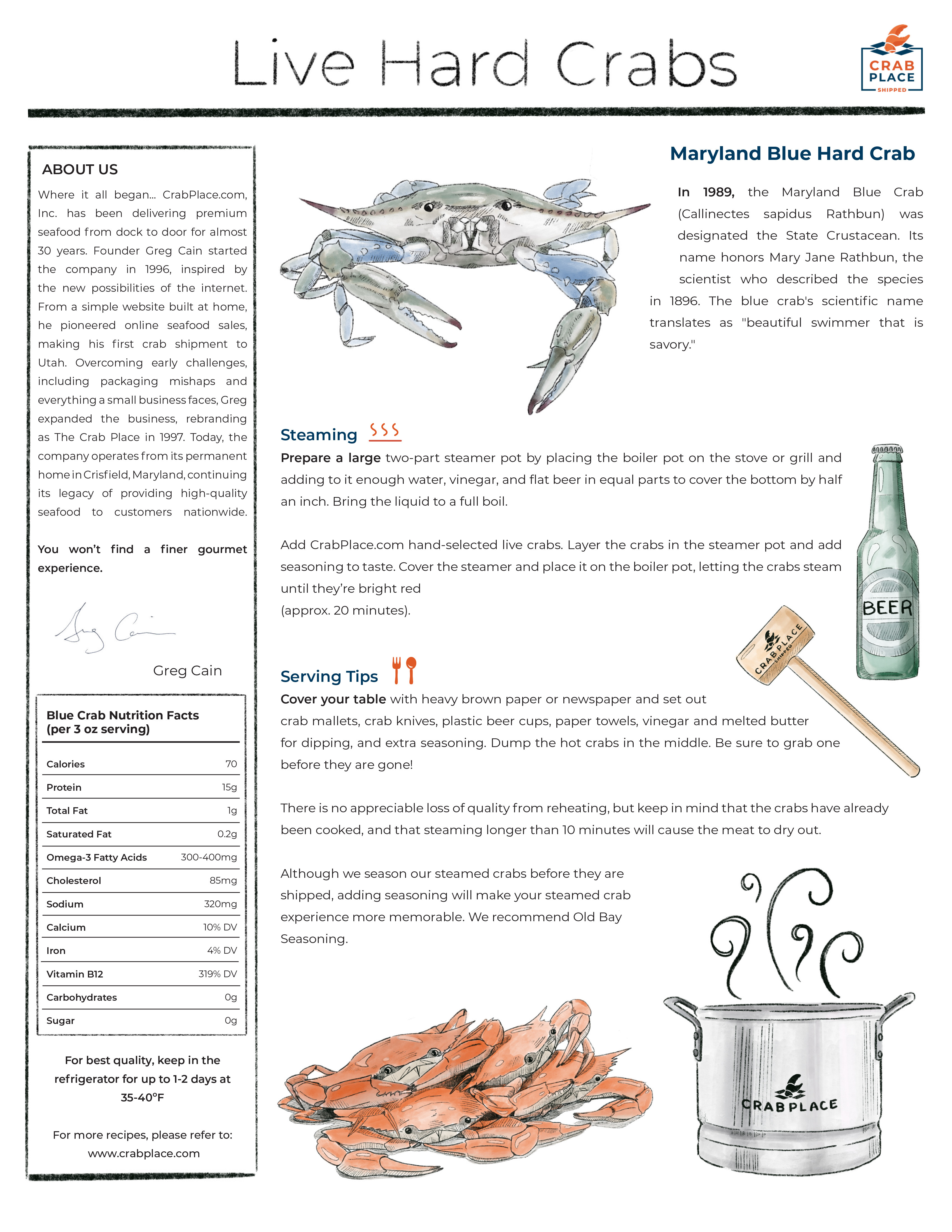Welcome to the home of the largest online Maryland blue crab retailer. Crabplace.com has been helping make family feasts fantastic for over 29 years. As the very first to sell seafood on the Internet back in 1996, we take pride in providing you exceptional quality and service! Join our community of THOUSANDS of satisfied customers and enjoy delicious, world-class seafood shipped straight from the Crab Capital of the World directly to your doorstep.