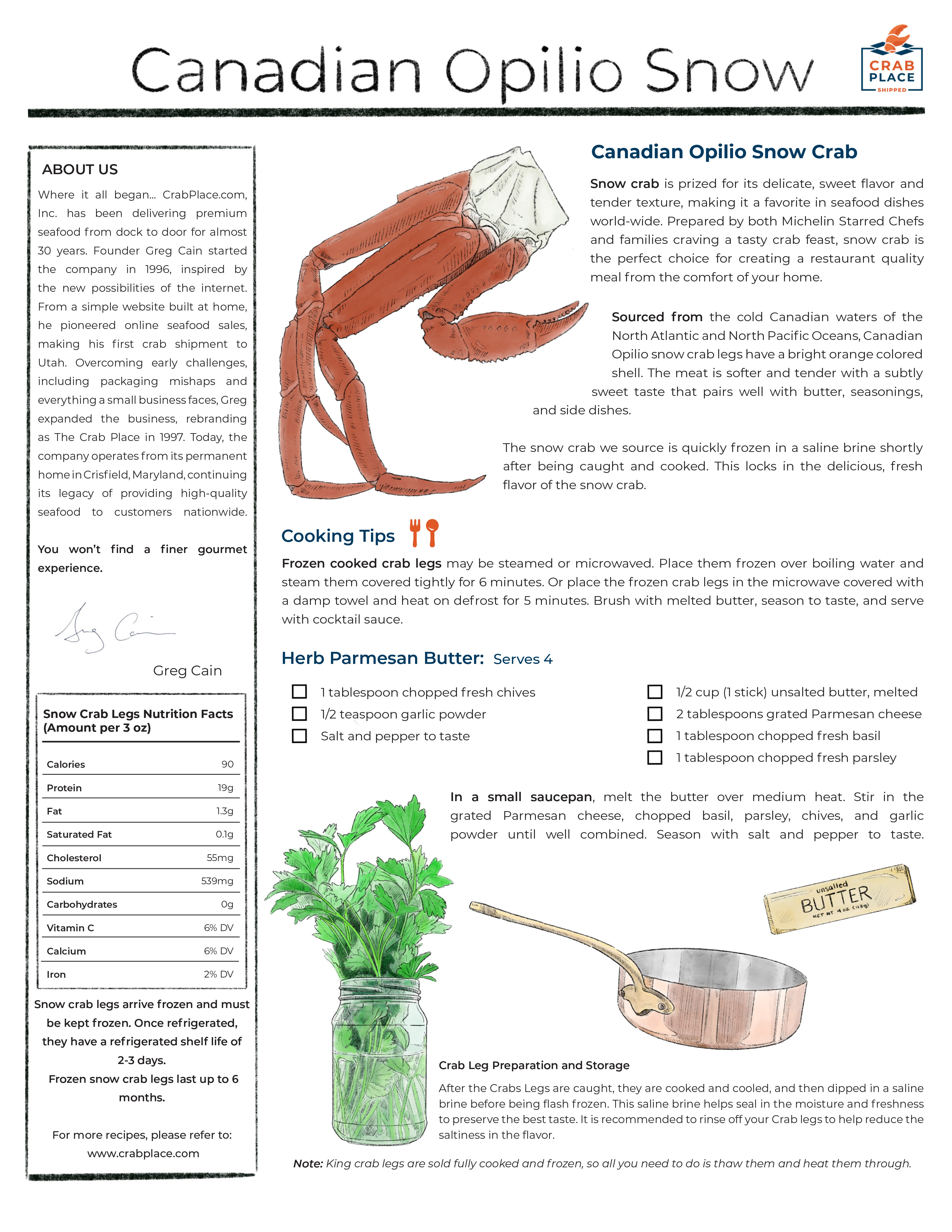 Canadian Opilio Snow crab is harvested from the cold Canadian waters of the North Atlantic & North Pacific Oceans. It's shell is bright in color and it's texture of meat melts in your mouth. The flavor is more subtle than Bairdi, and pairs well with butters & seasonings. It is prized for its delicate, sweet flavor and tender texture, making it a favorite in seafood dishes world-wide. Prepared by both Michelin Starred Chefs and families craving a tasty crab feast, snow crab is the perfect choice for creating a restaurant quality meal from the comfort of your home. Enjoy it on its own or as a complement to your favorite recipes!