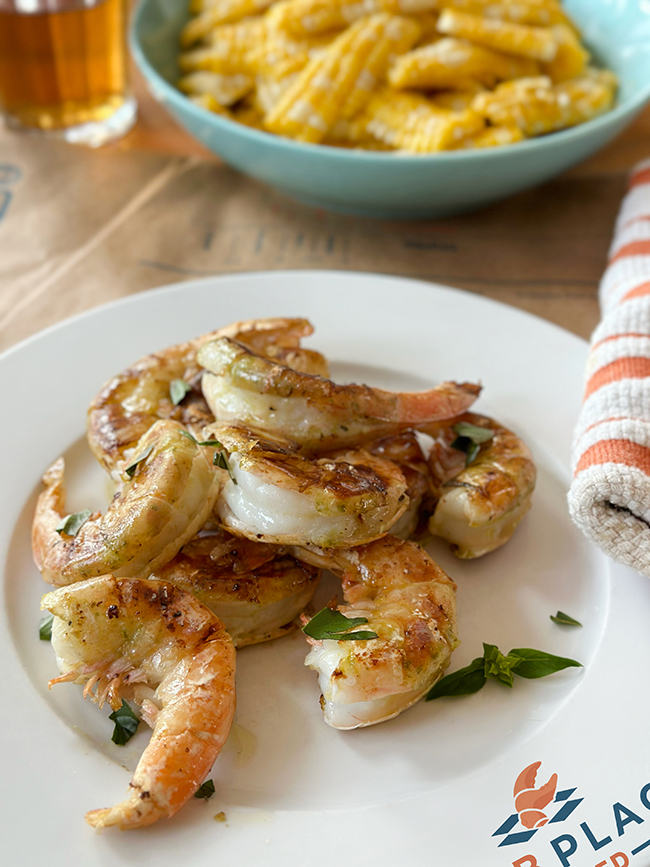 This method of grilling shrimp–in their shells on high heat–works well: the shrimp cook fast and stay tender and juicy. Once you have mastered this technique, I suggest creating a variety of stuffings based on your favorite ingredients. This recipe is especially handy for casual gatherings where easy preparation is very important. At the table, make sure to include napkins, as picking the shells off to get to the tender shrimp can get a little messy but oh so fun; and little bowls, for the discarded shells. This recipe takes 15 minutes of prep and 4 minutes of cooking time.